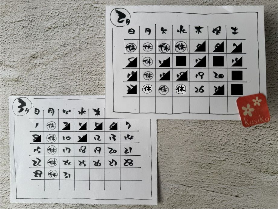 * 日付が「全て 消えてる日」・・・予約満席 又は 貸切予約あり 又は臨時休業